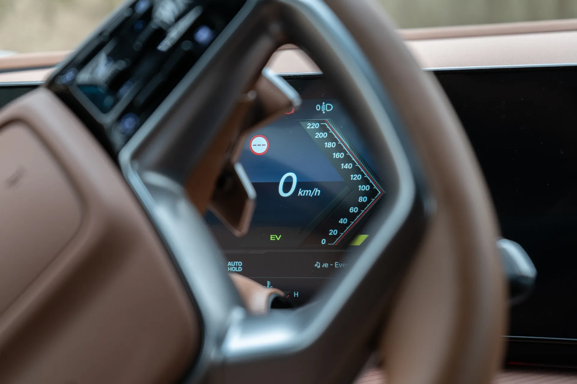 Érdemes néhány szót ejteni a kezelőfelületekről, hiszen van mit mondani róla, Az autóban szinte egyáltalán nincsenek gombok, helyette két, egyenként 12,3 colos kijelzőről tájékozódhatunk. A bal oldali kijelzőn a vezetéshez szükséges információkat, rengeteg számadatot, fogyasztási információkat kaphatunk. Mellette jobbra található az infotainment rendszer, ami egyben az autó fő kezelési egysége. Ha az utas hangerőt szeretne módosítani, azt a menüből érheti el. Ha a motorosan nyitható csomagtartót szeretnénk nyitni, az innen érhető el – szintúgy mint a klímapanel. Ez egy fájó pont, viszont legalább a rendszere stabilan működik, gyorsan kezelhető, egyszerűen megtanulható.